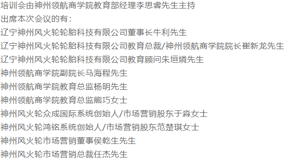 本次代理商培訓(xùn)會的明星導(dǎo)師10余位,將陪伴大家共同度過這三天兩夜。本次培訓(xùn)會旨在為新晉代理商伙伴闡述神州風(fēng)火輪企業(yè)文化、樹立整體市場觀念、規(guī)范營銷制度、拓展?fàn)I銷思路。